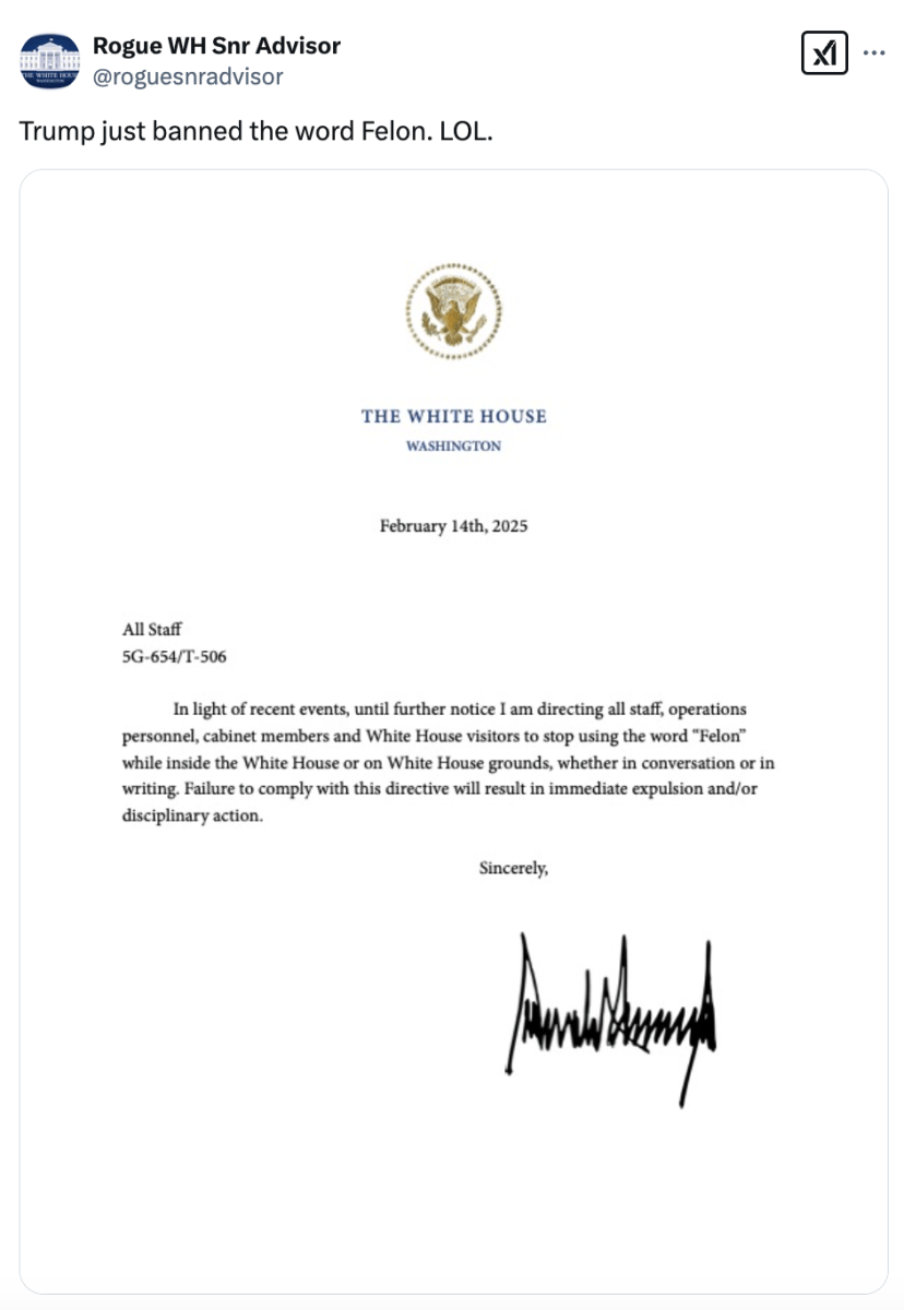 X (Twitter) user @roguesnradvisor went viral Friday morning for a tweet, in which they wrote: “Trump just banned the word Felon. LOL.” The press memo shared—which is completely unverified and was likely just doctored for jokes—explains that as of February 14, “all staff, operations personnel, cabinet members and White House visitors to stop using the word ‘Felon,'” referring to Trump’s infamous legal woes, where he was found guilty of 34 felony counts of falsifying business records.