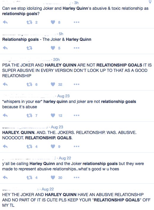 I think most adults will agree that Harley Quinn’s relationship with the Joker isn’t a positive one, but I also think that, unfortunately, many people also think that Harley Quinn’s “devotion” is a positive quality, and one that’s reasonable to expect of their partner.