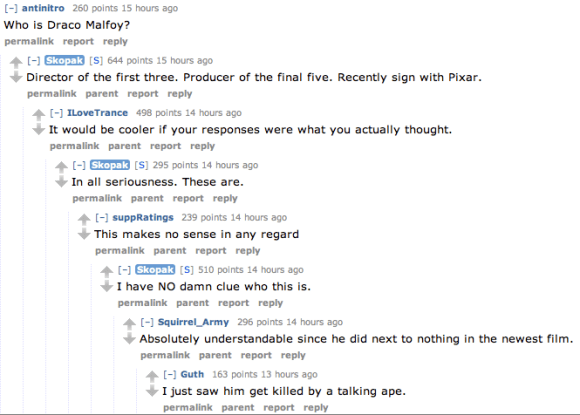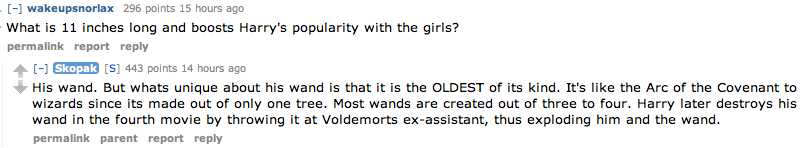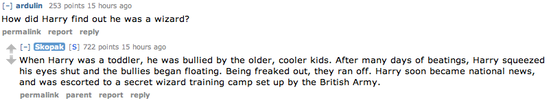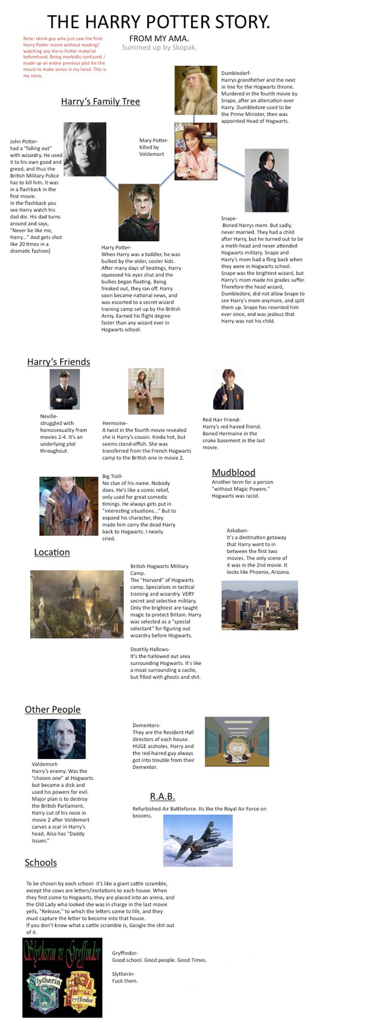 Reddit user Skopak has never seen a Harry Potter movie. He has also never read the books. So when he saw the last movie, he was confused, so he created his own story in his head. And now, he has made himself available to take questions on Reddit. If you cried during Harry Potter and the Deathly Hallows: Part 2, you are in for an even more emotional (though more confusing) journey. Click through for the most insightful responses.