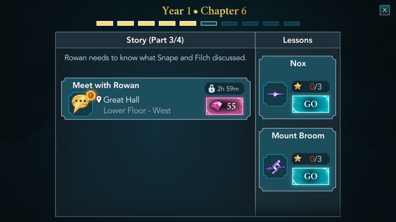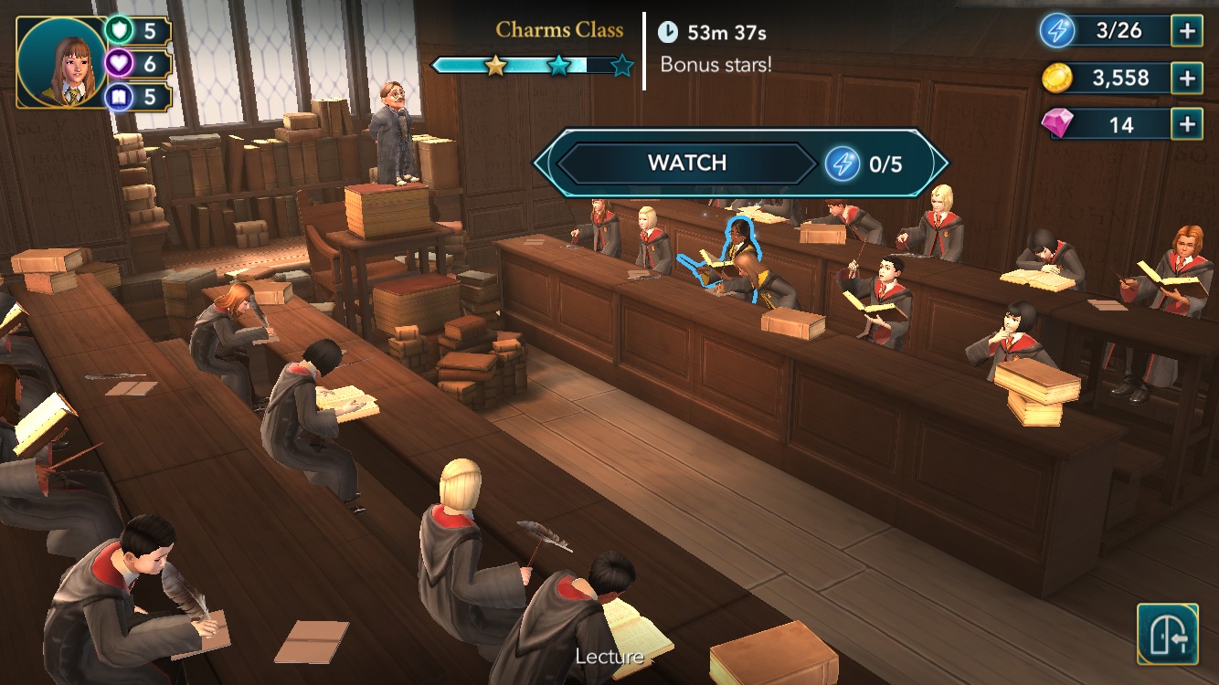 Your character has an energy bar that drains quickly during most activities. You start first year with a bar that holds 25 energy points, and each task–like, say, a class lesson–requires you to tap various objects to complete a number of mini objectives that make up the whole exercise. Two taps to turn the pages of a book, three taps to listen to Professor Flitwick, five taps to ask your brainy friend Rowan a question–you hit 25 in about as many seconds, and you may only be halfway done, or often less. You then have to wait four minutes for each energy point to recover, or spend real-world money to buy in-game gems, which will buy you energy, among other things.