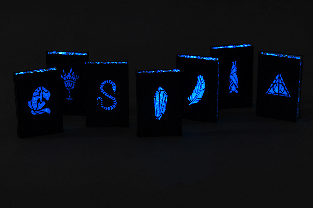 Nagy made new bindings and covers for all seven books, but fully illustrated Harry Potter and the Sorcerer’s Stone, including “interactive” illustrations that she hoped would “not distract attention from the plot, but add to the story.” Amazing!