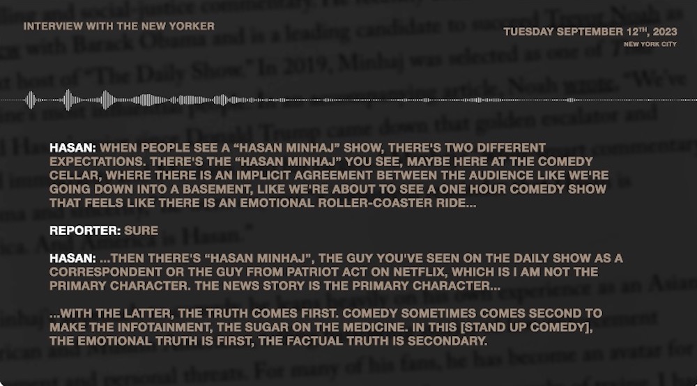 Malone summed up Minhaj’s approach to storytelling as “the emotional truth is first. The factual truth is secondary.” Minhaj said he fought to have his full quote included in the article, as it lays out a clear, thoughtful explanation of the difference between his stage shows and his news-comedy hosting roles—a distinction that Malone made central to her article yet omitted Minhaj’s explanation of.