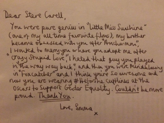 Steve Carell didn’t take home an Oscar for Foxcatcher last night, but he might have won the greatest prize of all: a personal letter of admiration from UN Ambassador and Generally Awesome Human Emma Watson! The note explained,