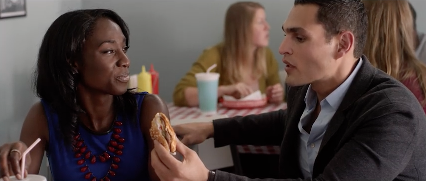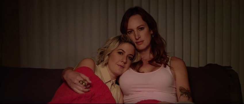 I love this opener. We’re then into the show proper, and it’s a scene at Violet’s place. Allie and Violet are together and having a fun night in, getting cuddly on the couch after Allie’s successful piece has been published. This is basically what spouse-human and I do: couch cuddles and Netflix bingeing; I can so relate to this scene, though it needs them surrounded by cats to truly represent my house experience. Then, Violet’s jerk-face boyfriend Mark comes home unexpectedly, and Allie gets a glimpse of the way Violet is currently living. Jerk-face is excellently played by Josh Wingate, because you can’t help but hate the guy. Violet has to get him a drink right away; she’s clearly afraid of him. As soon as he’s got the drink, Mark politely but firmly orders Allie out of the house. The scene includes Mark physically restraining Violet as he prevents Violet from speaking confidentially to Allie, and then he answers for her in conversation.