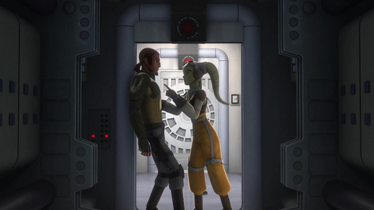 Both couples get so involved in their argument that blocking a hallway is no big deal. The thing is, these fights don’t end the same way. Han and Leia toss insults at each other and stomp off in frustration. Kanan yells back at Hera, but instead of accusing her, he more or less says, “I am upset because of my past, and I don’t trust these people!” Hera follows up with, “Talk to me.” And then 6’3” Kanan slouches against the wall so he won’t tower over her while they’re arguing. It’s beautiful. The scene concludes in a discussion rather than an argument, with Hera understanding and supporting Kanan while trying to talk him around. This particular conflict doesn’t end there, by any means. Hera won’t budge, and it takes Kanan time—most of the season—to come to terms with their involvement in starting a war, but from here on out, they’re working together rather than at odds.
