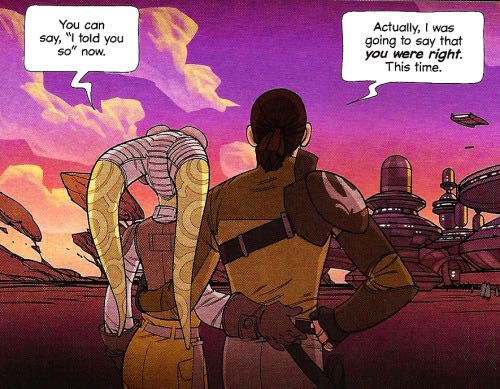 1200 words in, I think it’s only fair to tell you that Star Wars Rebels is not really about romance. Creator Dave Filoni has repeatedly stated that, while these two love each other, their relationship remains “something that is there and unspoken” throughout most of the series. Instead, the show focuses on parenting teenagers compassionately so that they can become their best selves and on standing up to impossibly powerful tyranny because sitting down while other people get hurt is intolerable. They have too much to do for the romance to be foregrounded. I like that. Good relationships aren’t about sitting around, gazing into the other person’s eyes while they talk about “us” ad nauseam. Good relationships happen when a couple works as a team and each supports the other person’s efforts to make the galaxy better.