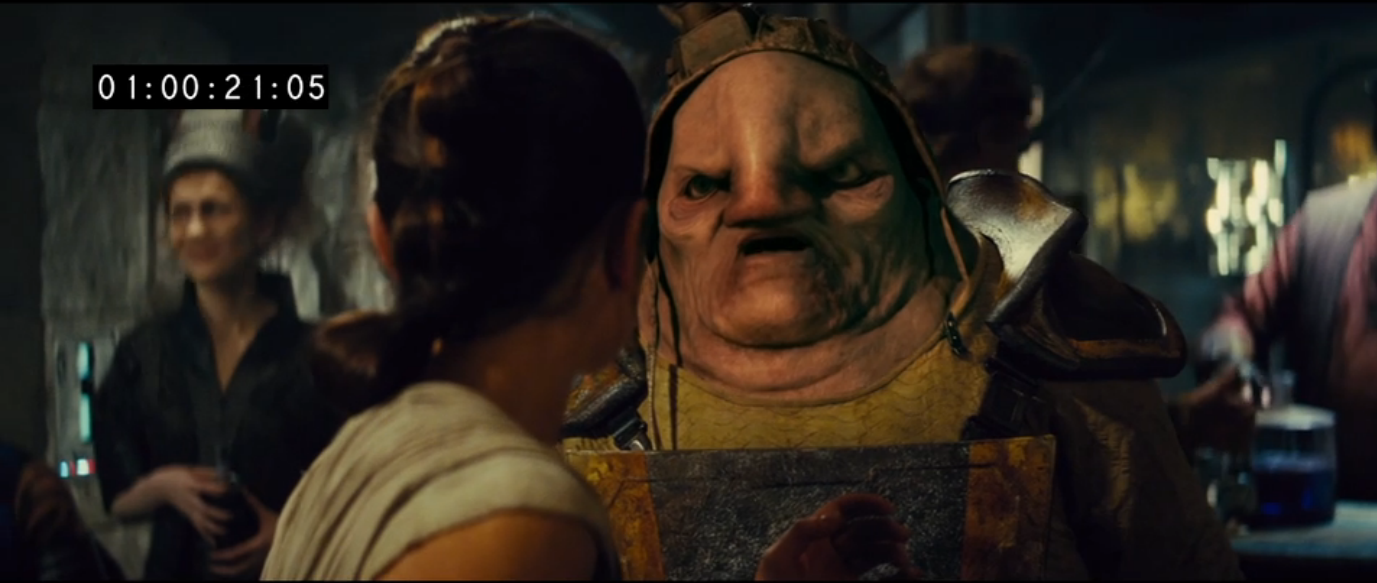 Apparently after Rey and Finn escaped Jakku in the Millennium Falcon, Plutt tracked them down, following them to Takodana. He pops up in Maz Kanata’s bar and accosts Rey, threatening her. Of course, Rey’s newfound pal Chewbacca is nearby and backs Rey up, getting all angry at Plutt, who just threatens Chewie right back, poking his bandaged arm.