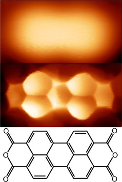 A scanning tunneling microscope works by bringing a conducting tip within a nanometer — one billionth of a meter — of a molecule being observed and applying voltage, which creates a vacuum through which electrons flow, allowing scientists to gather information about the molecular surface. (The Wikipedia article on STMs explains in greater detail how this all works.) Scientists at Germany’s Jülich Research Center discovered previously that coating the tip of an STM with hydrogen would allow them to see molecules’ inner structure; part of what makes this technique attractive for researchers is that it doesn’t require expensive new equipment but can be done with existing STMs.