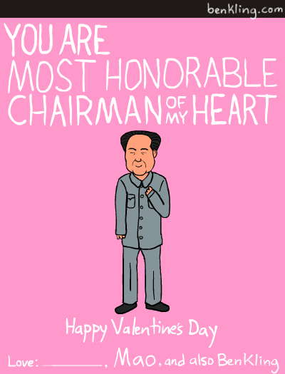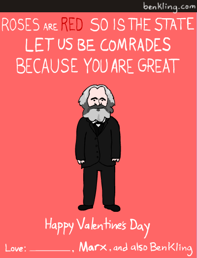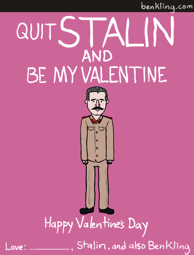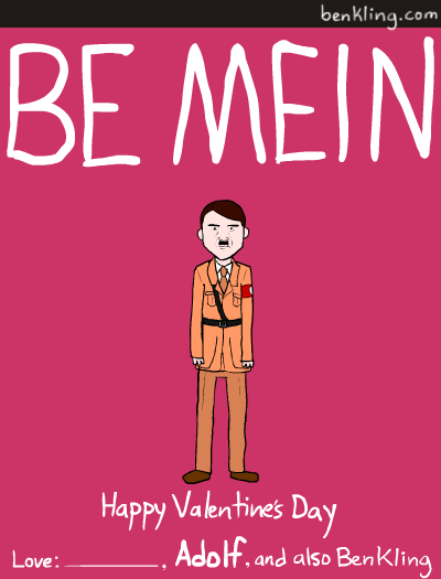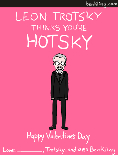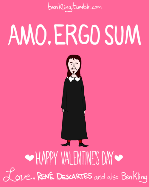Valentine’s Day is a great excuse for awful puns, but artist Ben Kling takes it a step further with his historical figures series of Valentine cards. You Kant believe you went all day without seeing these. On his cards, Kling has taken the likenesses of famous dictators, philosophers, U.S. statesmen, and a few surprising additions to create a set of truly charming and somewhat educational Valentines that you can print out and give to your sweety. And should he or she fail to recognize the significance of the featured historical figure, you can politely inform that they failed the test. See the rest, after the break.