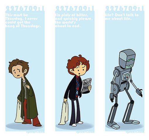 Hoopy frood Amanda Lien based these The Hitchhiker’s Guide to the Galaxy bookmarks off an earlier poster of hers. Zaphod and Trillian bookmarks are behind the jump.