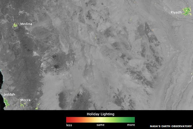 But Christmas isn’t the only holiday that sees the effect. In fact, the Islamic holy month of Ramadan causes an even bigger increase in nightly illumination during the summer, when Muslims fast during the day and become more active in evening hours. That time shift causes some cities in the Middle East to see as much as a 60-100% increase in brightness without even needing any 15-foot, blow-up Snoopy lawn ornaments in Santa hats.