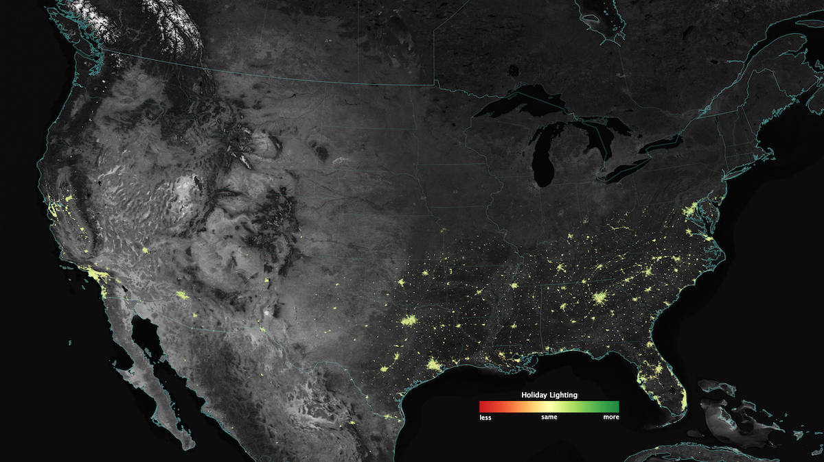 From Thanksgiving through the new year, U.S. cities get about 20-30% brighter, while all those crazy light displays on big lawns in the suburbs increase nighttime light by 30-50%.
