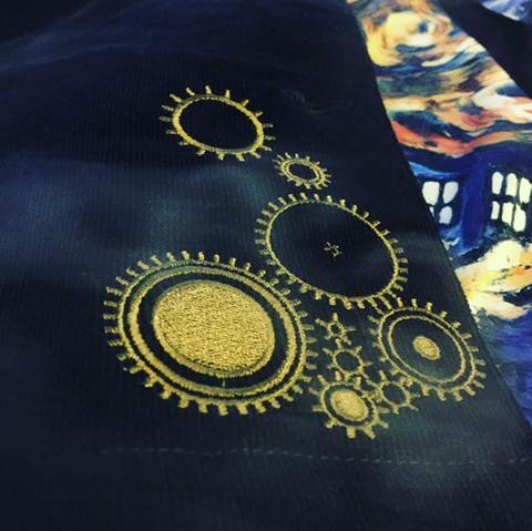 The TARDIS is as much a star of this collection as she is in the Doctor’s life. Check out this beautiful TARDIS coat ($89.50) with an exploding TARDIS lining (the photo at the top of this post is a detail from the lapels):
