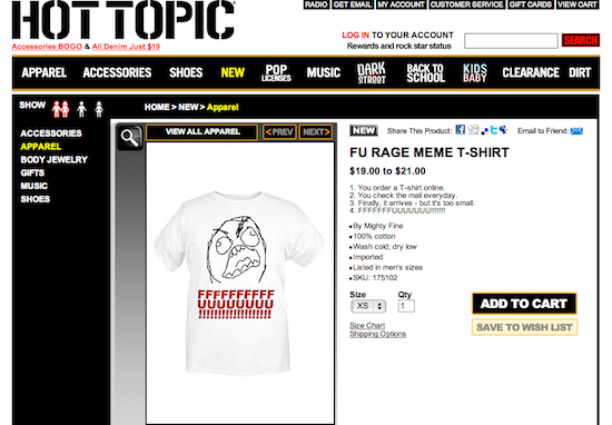 We’ve previously covered Hot Topic‘s Internet-enraging pilfering of the Rage Guy meme, which they sold in t-shirt form while managing to get many details very wrong. But that’s all over now. Following a devious 4chan campaign to get Hot Topic to pull the FFFFFFFUUUUUUUUU-spouting “FU Rage Meme T-Shirt” by associating it with racism, the clothing retailer has complied, and says it will stop selling the t-shirts.