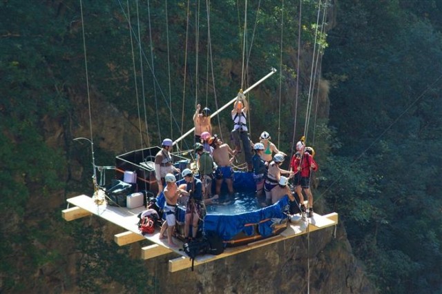 The team seems to build the hot tub while it is being suspended, rather than suspend a completed tub.