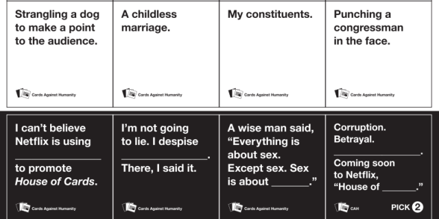 In order to promote the upcoming second season of House of Cards, Cards Against Humanity teamed up with Netflix to create a series of HoC (that’s how the kids abbreviate it, right?) themed white and black cards to throw into your deck. They explain on their website:
