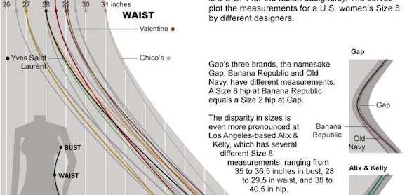 To accompany an article about various businesses’ increasingly complicated efforts to give women some kind of way to easily tell what size they are in any given brand, the New York Times prepared this infographic featuring all the different kinds of ways that you can be a size 8, from a 26 1/2 inch waist, to a 31 inch waist. Full pic below.