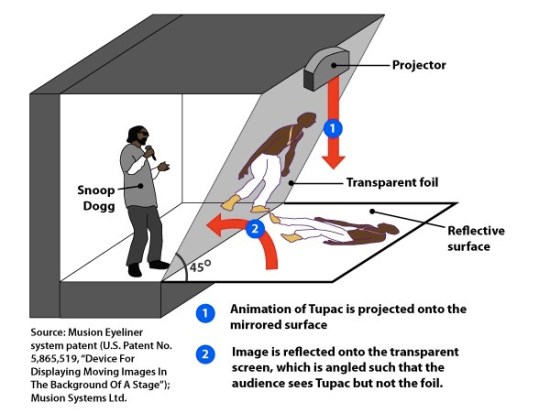 Technically, Coachella Tupac wasn’t a hologram, but was a two-dimensional video projected on a screen that the audience couldn’t see. The image of Tupac wasn’t some kind of old footage of the rapper cut together in a convincing way, but was an animation, and was projected onto a mirrored surface, which reflected the animation back to a transparent screen which was set up in such a way that the audience could only see Tupac and not said screen.