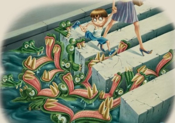 Back in ye olden tymes when I was a kid and played outdoor games with my neighborhood friends, we used to imagine that the woodsy patch separating two houses was real quicksand, and we never went over there. Ever. These illustrations, by Pierette Diaz, will probably remind you about how our young eyes (and ears) were interpreting things a but differently than they do now.