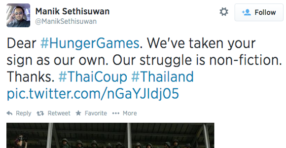 We found this tweet through The Hollywood Reporter who write “protestors have begun flashing the gesture as an act of defiant solidarity against the recent takeover of Thailand’s civilian government by the military.”