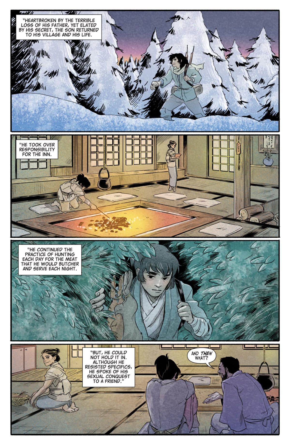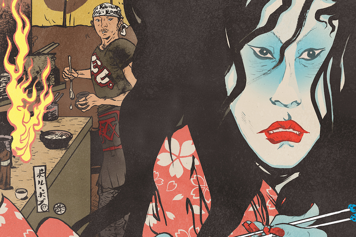 Bourdain and Rose’s graphic novel substitutes chefs in place of the traditional samurai, dared by a Russian oligarch to play the game on a dark, eerie night. In addition to the classic stories of yokai, yorei, and obake (all terrifying forms of supernatural beings), the tales all share a common thread that you might expect from Bourdain’s work: food.