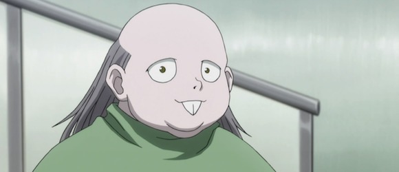 But above and beyond these characters, there is Senritsu (or “Melody” in the English translations), who we meet working for a mob boss alongside Kurapika during the third season. Senritsu is short, fat, balding, eyebrowless, and buck-toothed. She has a serious degenerative skin condition because of a curse placed upon her from hearing an ancient musical composition called the “Sonata of Darkness,” but the audience has no way of knowing whether or not that same curse – which was meant to kill her – had any affect on the rest of her appearance. And despite her supposed “ugliness,” she is one of the most caring, thoughtful, and interesting characters in the series. She is a musician with both the ability to influence peoples’ emotions through playing the flute, and the ability to hear sounds no normal human ears can – including heartbeats. Senritsu’s goal is to find a way to reverse the curse which was cast on her, and she will use whatever means necessary to do so. She aids the protagonists repeatedly, despite the fact it never directly benefits her, and she constantly has to bring the normally-rational Kurapika to his senses whenever he gets angry enough to take foolish risks for the sake of revenge (which he does an awful lot from season three onward).