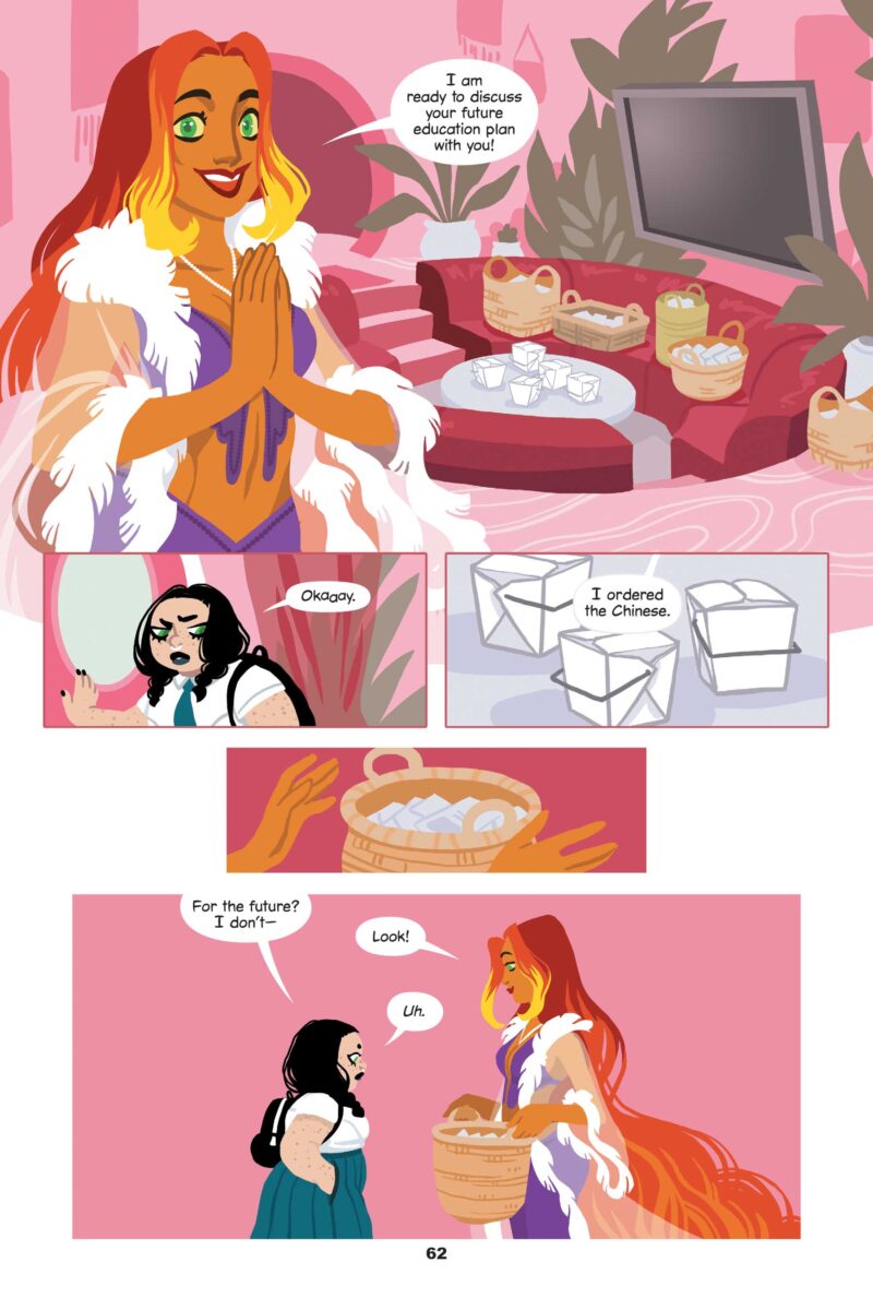 Along with the trailer we also got an excerpt from the graphic novel. The excerpt focuses on Mandy’s relationship with Starfire, who is the kind of glamorous mom that walks around the house in an, admittedly, fabulous robe. She’s excited to present Mandy with a literal basket full of college applications, unaware of the anxiety her daughter’s feeling about the whole thing.