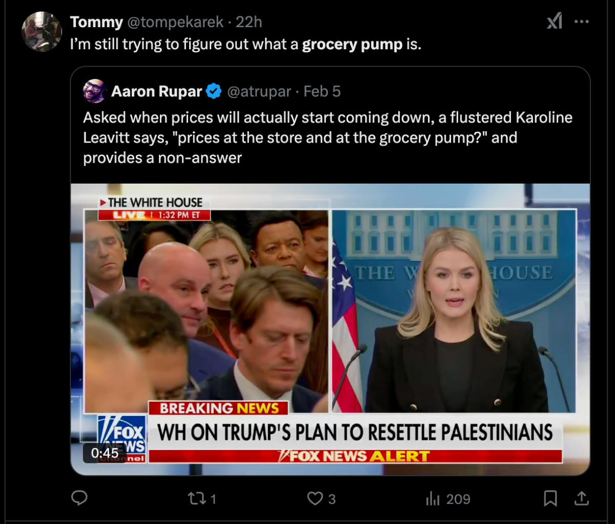 Journalist Edward Lawrence representing Fox Business asked Leavitt: “So now that the President Trump’s policies are starting to take shape, how long will it take to cycle through and get some of the actual prices that Americans are paying to come down?” The question appeared to ruffle Leavitt because she asked for clarification and in the process misspoke. “Prices at the store and at the grocery pump?” she asked.