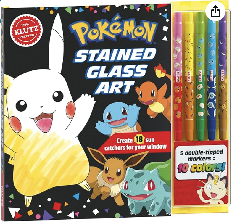 This Pokémon Stained Glass art set includes a 42-page book with fun facts and coloring pages, 5 double-tipped markers, and is perfect for kids to create some amazing window art.