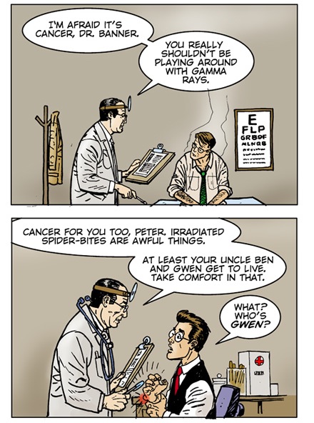 Turns out there’s really only one thing radiation has ever given anyone. On the other hand, there’s Marvel’s Cancerverse, “a universe where ‘death was defeated’… a reality where nothing dies and life has expanded exponentially, resulting in a universe-wide living corpse.”