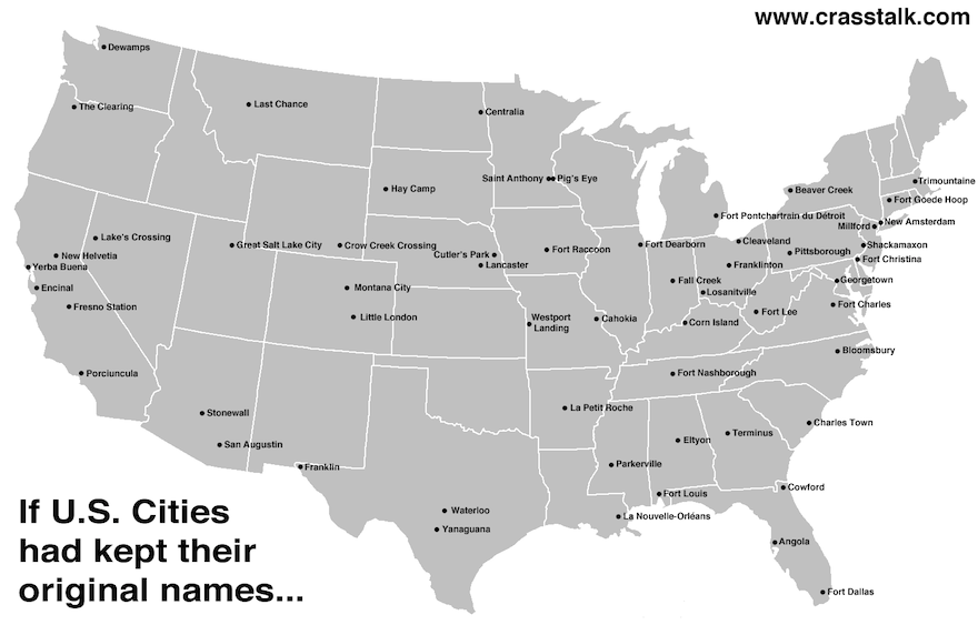 Daniel Geduld put together this great map of the U.S. if some of its biggest cities had kept their original names. Some of the changes aren’t all that big — “Great Salt Lake City” vs. “Salt Lake City” isn’t earth-shaking, nor is Nouvelle-Orléans vs. New Orleans — but it’s tough to imagine Microsoft setting up shop in Dewamps, Washington, or the San Antonio Spurs if their home base was called Yanaguana.