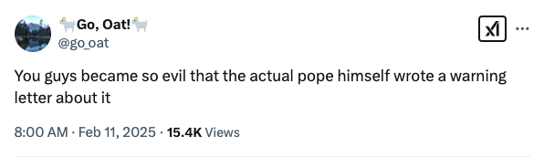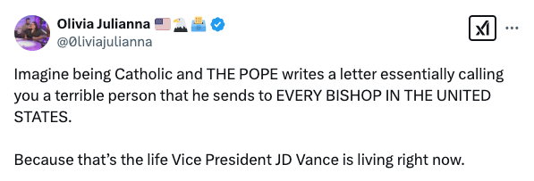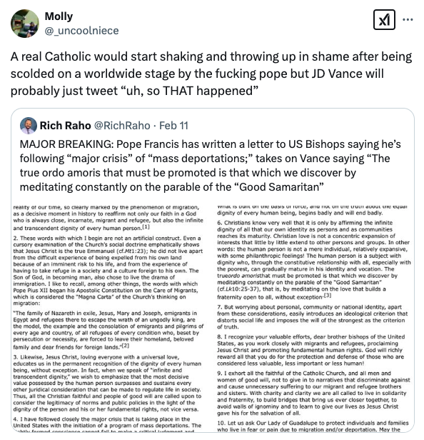 Vance, a recent Catholic convert, has increasingly positioned himself as a bizarro interpreter of Christian doctrine by invoking “ordo amoris,” a theological concept of ordered love, to justify prioritizing citizens over immigrants. Critics say this misrepresents fundamental Christian teachings. “What is built on the basis of force, and not on the truth about the equal dignity of every human being, begins badly and will end badly,” Francis warned.