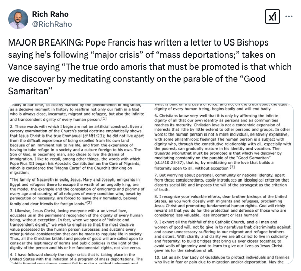 The Pope urged Catholics to “not give in to narratives that discriminate and cause needless suffering to our migrant and refugee brothers and sisters.” He directly challenged Vance’s interpretation of Christian love, stating the “true ordo amoris that must be promoted is that which we discover by meditating constantly on the parable of the ‘Good Samaritan,’ that is, by meditating on the love that builds a fraternity open to all, without exception.”