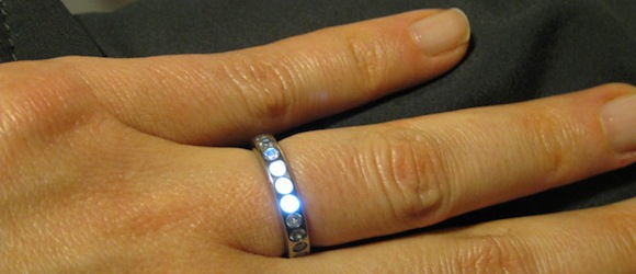 Ben Kokes went through ten prototypes for this ring before he came up with one worth presenting to his fiance Mary, “because doing things in the most complicated way possible is just what he does to show the love.” Those are real white and blue gemstones illuminated with LEDs, but they only light up when the ring is near an “induced alternating magnetic field.”