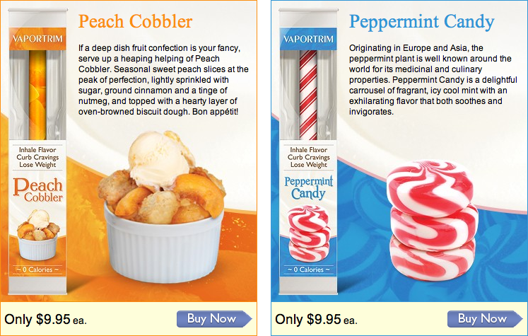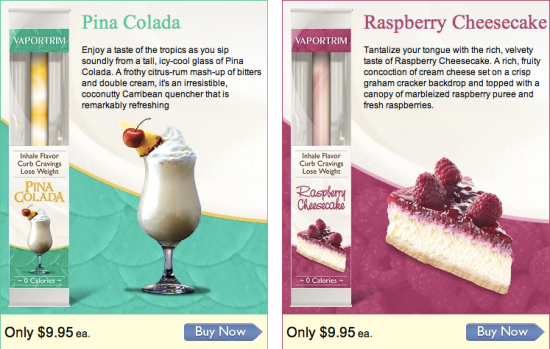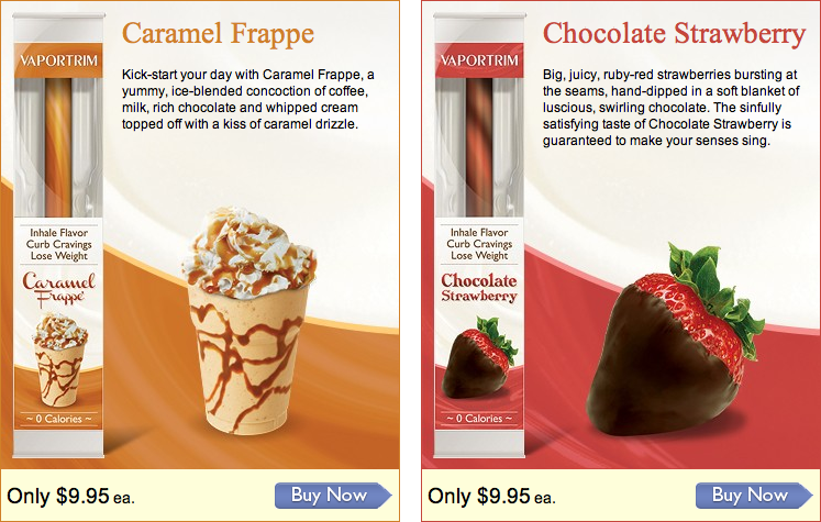 You might’ve seen people smoking those e-cigarettes every now and then; they’re supposed to simulate the feel of smoking, but replace the actual smoke with a supposedly much healthier vapor. Diet company Vaportrim is attempting to recreate that type of alternative to smoking that e-cigarettes are trying to provide, but with dessert. Presenting, inhalable desserts, including cupcake, strawberry shortcake, cinnamon bun, peach cobbler, milk chocolate, and more.