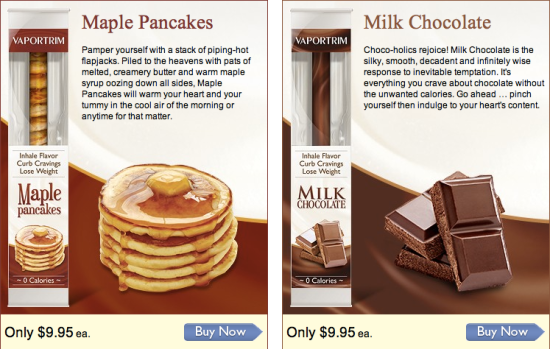 Inhalable seems to be the trend lately, with e-cigarettes and that new inhalable caffeine shot, so dessert seems like as good a place as any to continue the trend. In theory, the Vaportrim sticks provide a shot of flavored mist, which is supposed to affect your sense of taste and smell in such a way that it curbs your appetite. As we all know, smelling delicious food when you are hungry only makes you hungrier, and having a taste of said delicious food when you’re hungry pretty much seals the deal that you’ll be eating the rest of it, so it is suspect that the Vaportrim inhalers will actually curb one’s appetite.