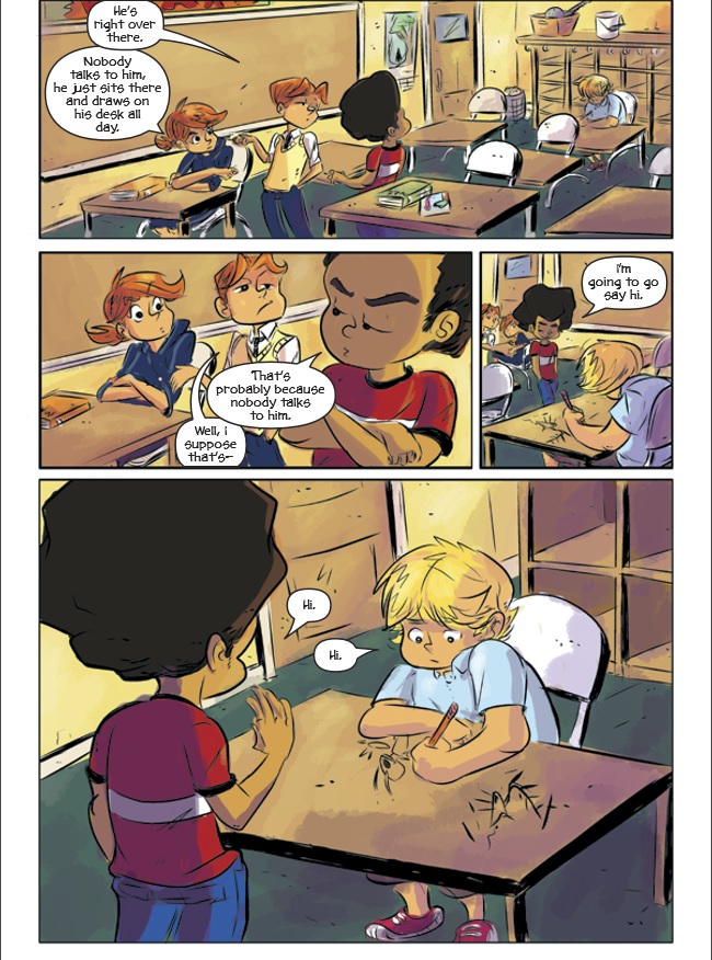 His love of working with children doesn’t stop there. While working on this book, as well as previously, Doucet has been involved in teaching kids between the ages of 6 and 12 how to create comics, and he says this has helped him with his own work, teaching him what kids respond to (or don’t) in their storytelling.