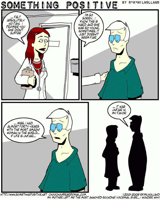From the beginning of the comic Davan has mentioned, remembered, and visited the graves of friends who committed suicide. In recent years Something Positive has also addressed the grim realities of having a parent die and of having a parent slowly lose their identity to Alzheimer’s.