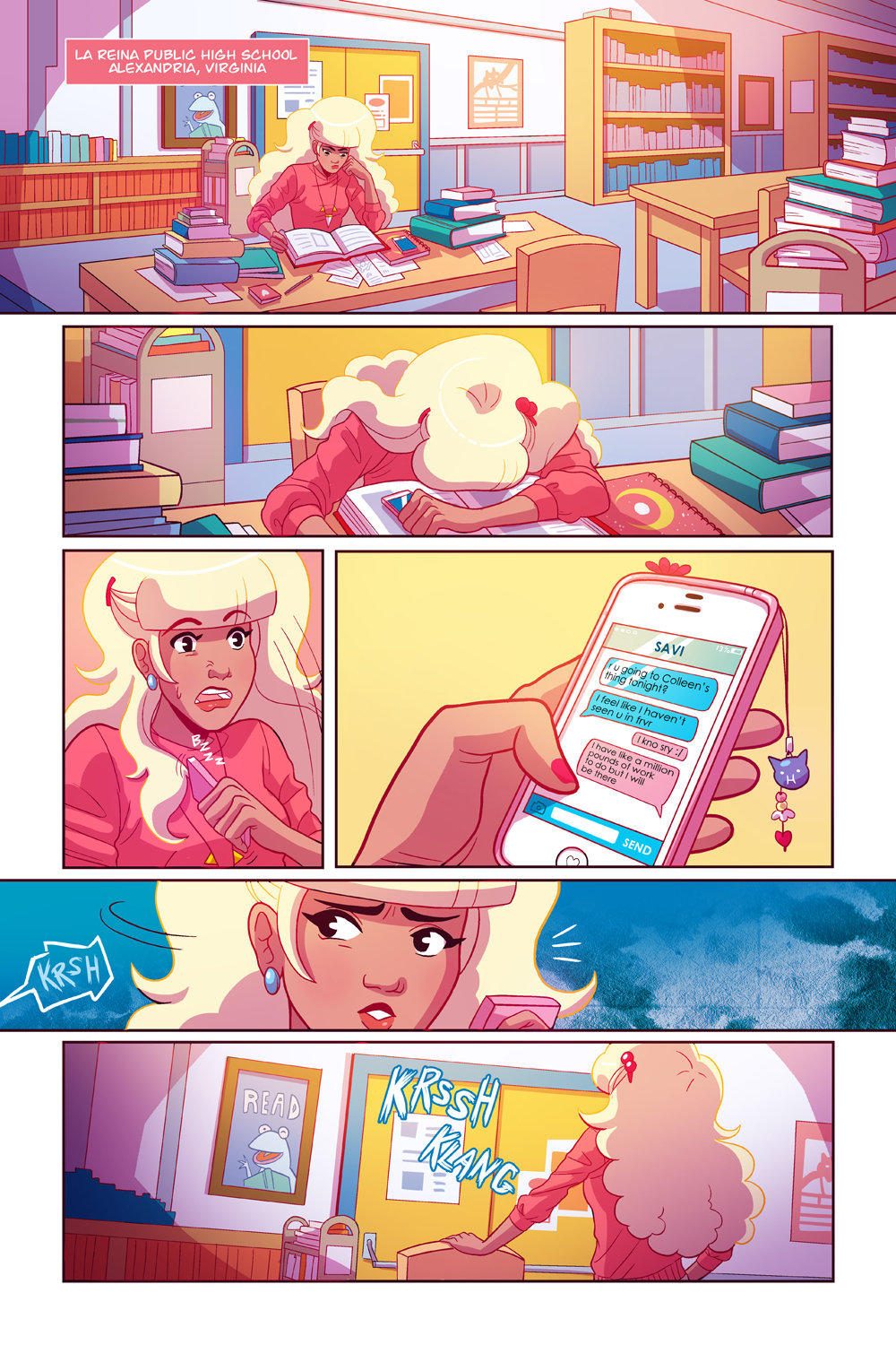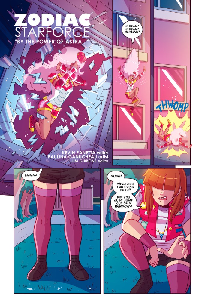Kevin Panetta: Hi! So Emma, Kim, Molly and Savanna are Zodiac Starforce, a group of friends with magical powers who get thrown into a crazy world of demons and evil goddesses. They are really good at beating up bad guys. So good that they kind of beat up ALL the bad guys and save the world. So when our story starts, the team is actually broken up and trying to get back to their normal lives.