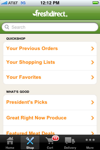 FreshDirect is an online grocery store that delivers in the NYC area. I needed to do an order this morning, so I downloaded their iPhone app on my iPad and discovered that grocery shopping is one of those things that the iPad is *perfect* for (an it would be more perfect with a native iPad app). You just take the thing into the kitchen with you, rummage through the cabinets & fridge, and add what you need to your FD shopping cart. Then you take the it with you around the rest of the house (the bathroom, the garage, the pantry in the basement) adding needed supplies as you go. It inverts the usual “wander around the grocery store searching for items” shopping practice; instead you wander about the house looking for what you need.