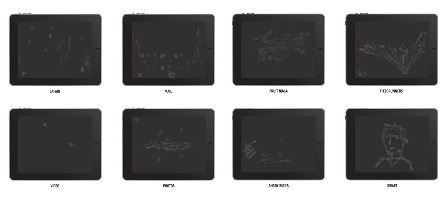 My method involved cleaning the iPad’s surface with a microfiber cloth, using an app for a short amount of time, then turning the screen off. Next, I photographed the iPad, positioning a light source and some black matte board to limit distracting reflections. I then brought the photographs into Adobe Illustrator, and created vectors of the iPad and the fingerprints to emphasize the data.