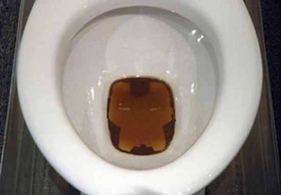 After spending around two months looking for a toilet bowl that was oblong in such a way that was similar to Iron Man’s face, the student then ate edible pigmentation in order to create black, green, and red urine, which he then turned into the toilet rendition of Iron Man seen above. He also used some of his saliva to make foam used in the piece. Reportedly, at the art competition, his work created a terrible odor.