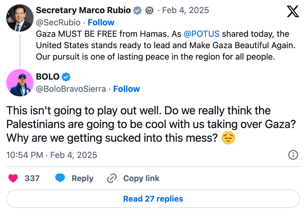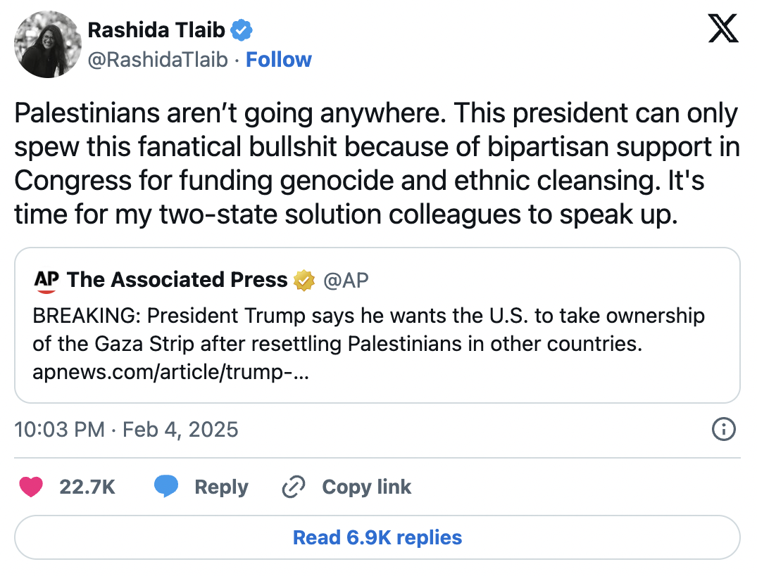 In a post shared above, Palestinian American Rep. Rashida Tlaib summed up many Americans’ response to Trump’s statements in post on X, writing: “Palestinians aren’t going anywhere,” and heavily criticizing Trump’s less-than-favorable remarks.