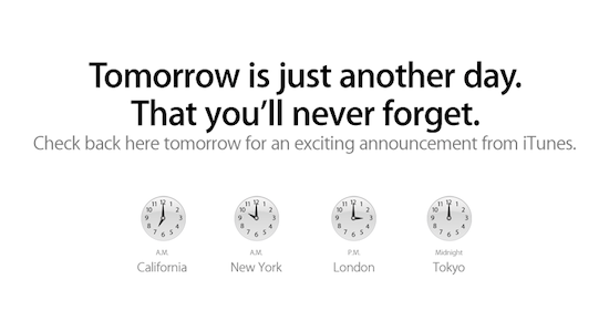 Currently, if you mosey on over to Apple’s website, you’re greeted with the above graphic that’s making a pretty serious claim: At 10 a.m. EST tomorrow, Apple will make an iTunes announcement that we’ll never forget. Never is a long time, so Apple must think they’re announcing something pretty amazing.