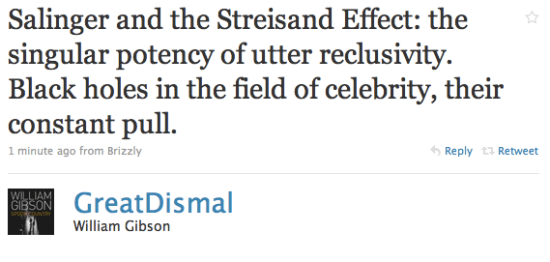 “Salinger and the Streisand Effect: the singular potency of utter reclusivity. Black holes in the field of celebrity, their constant pull.”