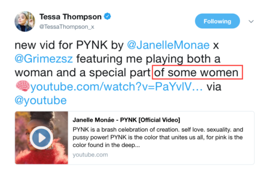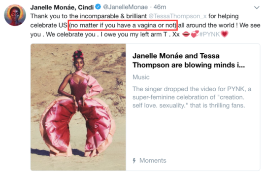 But Monáe and Thompson were both thoughtfully careful in their language around “PYNK” to point out that not all women have that anatomy. On Tumblr, user bluearrow126 compiled and highlighted the instances they found: