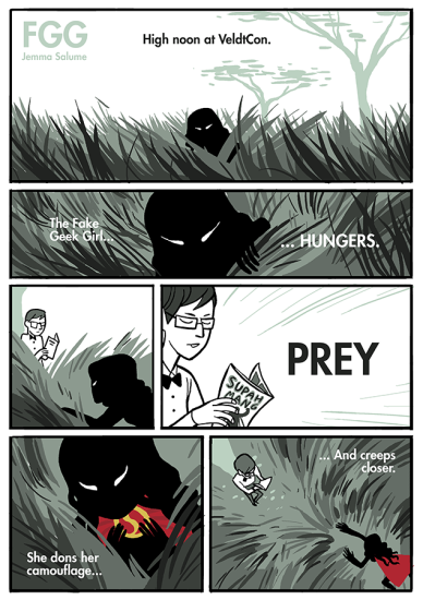 I won’t say this comic from Jemma Salume is better than the one we posted last week from Meghan Danger, but it wins for illustrating exactly what artist Tony Harris seemed to be accusing certain cosplayers of in his recent Facebook rant. In the most literal, comedic way possible. Hit the jump to find out what happens when this “Fake Geek Girl” preys on the unsuspecting, “Super Mang” reading dude at VeldtCon.