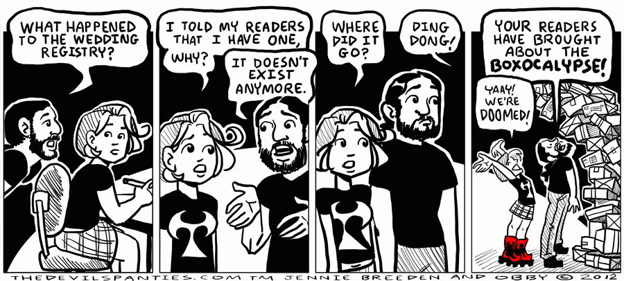 Among the perks of writing a webcomic: You might find that your readers are so generous that they’ll literally buy you every single thing on your bridal registry. That’s what happened when Jennie Breeden, creator of The Devil’s Panties, posted a link to registry online, only to have her fans buy out the entire thing within six hours.