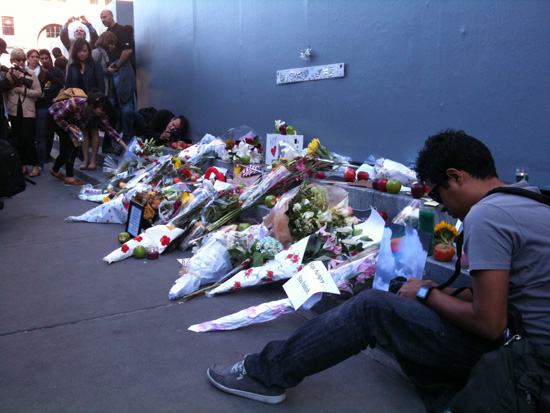 We’ve talked on the site about what the death of Steve Jobs means, but it’s still strange to see such public displays of grief at — of all places — a high-end retail outlet. In truth, while these people surely feel sadness, they seem to be mourning Steve Jobs the character, the public figure. As such, perhaps it’s fitting that they express their loss at the place most connected to that persona.