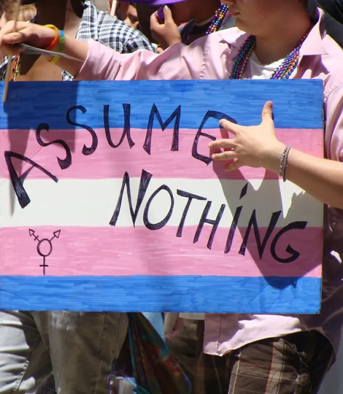 (Trans pride flag image via Torbakhopper on Flickr; “Assume Nothing” image via Marilyn Roxie on Flickr)